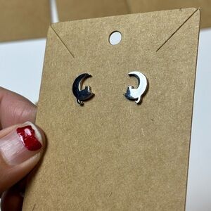Super cute stud style earrings. Cute silouhette of cats sitting on a crescent moon. They have a silver-color finish, though I found that hard to photograph. Earrings are stainless steel.