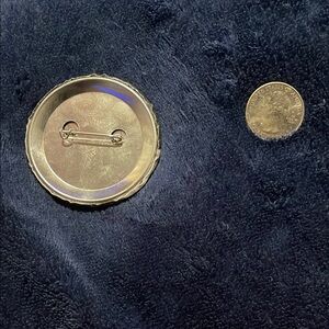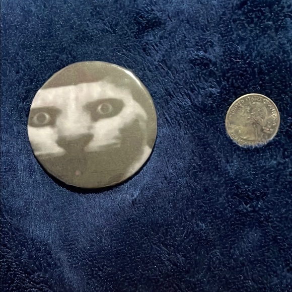 Round button pin with cat in shadows. Quarter for size comparison.