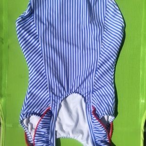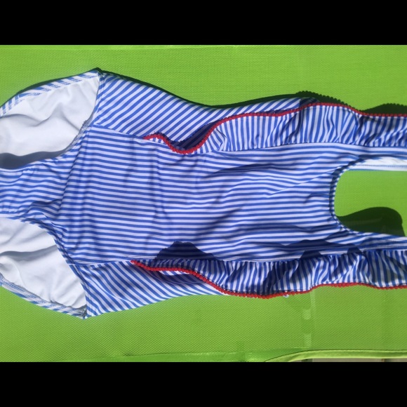 ❌SOLD❌ Girls size XL 14-16 one piece Blue & White stripe pattern Ruffle sleeve Wide shoulder ruffled panels trimmed in red