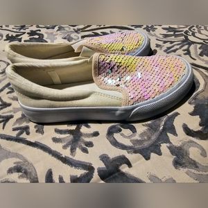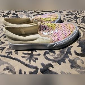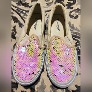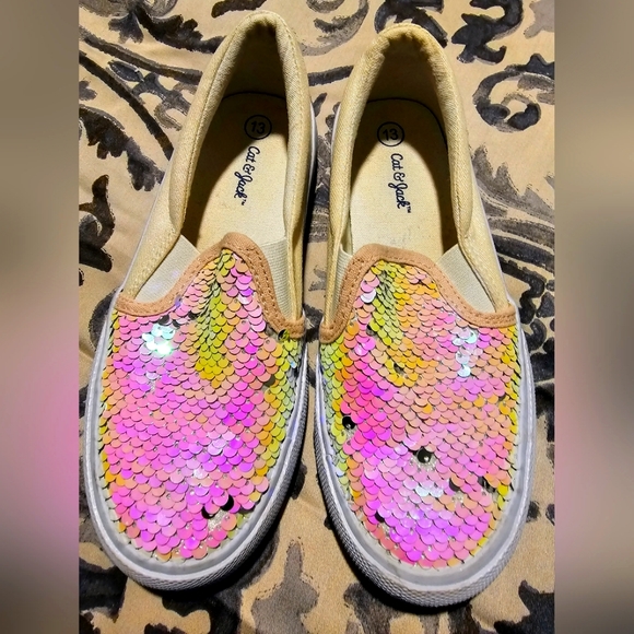 Cat & Jack slip on girl sneakers in great pre-owned condition top part covered in sequins side and back side covered in matted glitter size 13