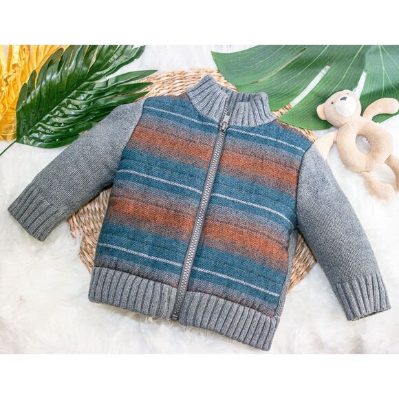 Featuring a soft knit design with gray sleeves and a striped teal and rust body, this zip-up coat is perfect for cool-weather outings. The ribbed cuffs, collar, and hem help lock in warmth, while the full front zipper makes dressing quick and easy.
