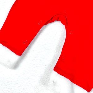 Cat & Jack Baby Santa red one piece with attached Santa hat with pom pom. The belt and Santa beard are appliques/sewn on embellishments. The fabric content is mainly cotton and polyester. The white trim is plush and has a velvety feel. There are snaps around the inner legs for on/off. New with tags. On a hanger. See size info below.