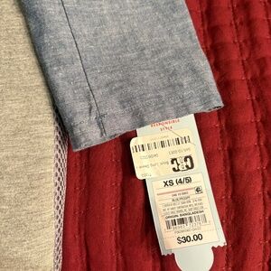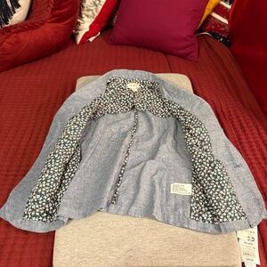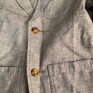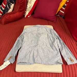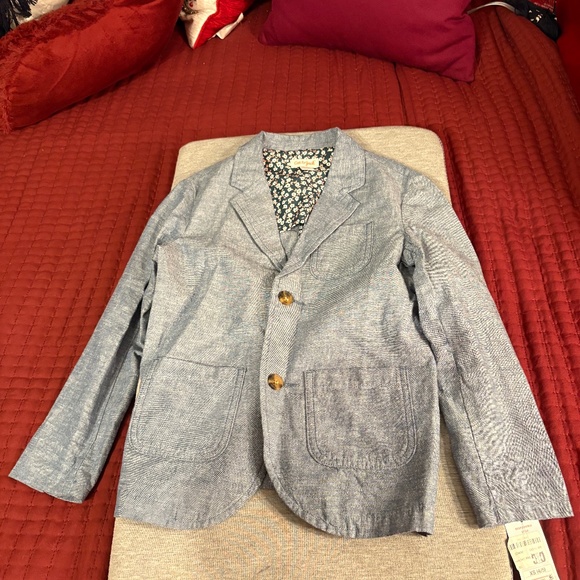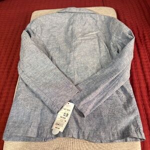 This a boys blazer made of 75%cotton and 25% linen and is blue in color. The jacket button up the front with two buttons and has three pockets on the front, two pockets at the bottom and one at the top. It has three buttons on each long sleeve. The jacket is a size 4/5 and the tags is attached. The jacket is brand new never been worn.