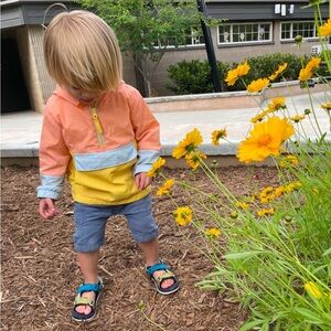 Loved this jacket -- such a bright and happy color block. My son outgrew this before we could wear it more! He is twenty six months in the pictures, if that helps for sizing.