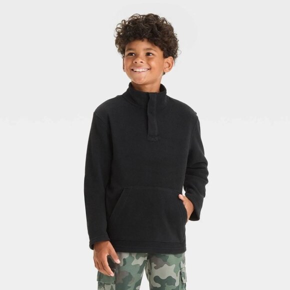 Cat & Jack boys fleece pullover, black 1/4 snap sweatshirt, kids XS 4-5 fleece top, recycled polyester microfleece, mock neck boys sweatshirt, kangaroo pocket pullover, warm winter kids top, classic fit fleece, soft cozy boys outerwear, Cat & Jack black fleece sweater