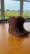 These brown boots from Cat & Jack feature classic western-style stitching and a pointed toe, perfect for adding a touch of cowboy flair. Made with a leather-like material, they offer both style and durability for any adventure. The elegant swirling patterns on the shaft add a charming detail to these versatile boots.