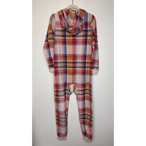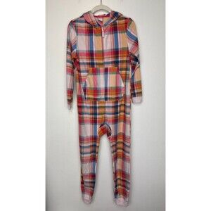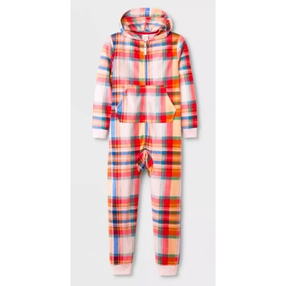 Cat & Jack Girls XL Plaid Union Suit One Piece Hooded Pajama Fleece Pink Red