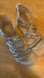 These sandals feature a back zip to allow for easier slide on, multiple straps with elastic ends for more stretch. Adorable rose gold color with tan and iridescent accents.