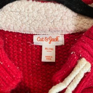 Boys XL Cat & Jack Red Cotton Blend Sweater, featuring a cozy textured knit design. This vibrant red sweater is perfect for holiday events and festive occasions. Can be layered over a shirt or turtleneck. Three-button closure and Sherpa lining inside the collar. Perfect condition—only worn once. Lovely bright shade of red.