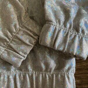 Cat & Jack jacket, girls' 18 months, 60% cotton/40% recycled polyester. Zip closure, crewneck, ruffle along armpits, elastic band on cuffs and hem, gold holographic fabric. No flaws.