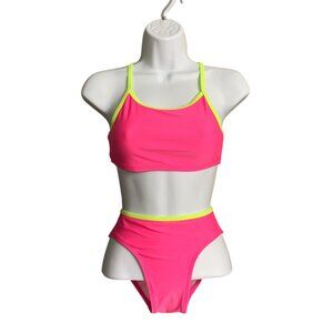 Durable and stylish two-piece bikini set designed for juniors. The vibrant pink and neon green accents create a fun and eye-catching look for swim activities.