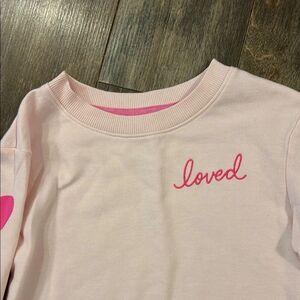 A light pink sweatshirt with bright pink heart shapes on the sleeve, featuring a logo on the chest area.