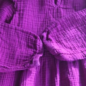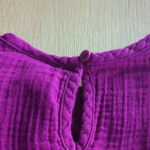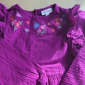 Adorable magenta dress with ruffle sleeves. Features floral embroidery. Ideal for casual outings.