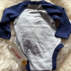 Cat & Jack Newborn Onesie. NWT. The body is grey and the sleeves are navy.