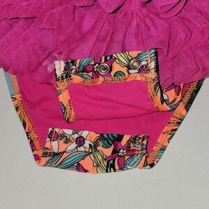This is the most adorable swimsuit. Is such bright colors. Has the 3 snaps at the crotch area. Tutu type layers. No damage.
