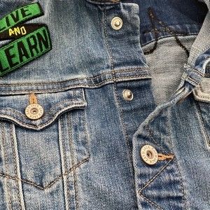 This Cat & Jack denim jacket with patches and "Be A Hero" embroidery across the back is ADORABLE on any little one. Patches include "Fly," "Live and Learn," and a football on the back. Snap buttons up the front are easy for the littles. Mismatched denim on the right arm, with slit pockets.