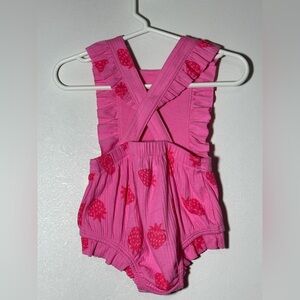 Adorable pink baby romper with strawberry print. Features ruffled straps and snap closures.