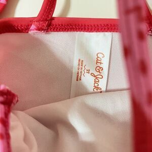 Cat & Jack Pink Strawberry Tankini Bikini 2 Piece Swimsuit Girls Size 2T. New With Tags, never worn or washed, but the hygiene sticker has been removed from the inside. Cat & Jack calls the color Watermelon Pink. Pretty pink color with strawberry print and ruffle one shoulder style with pink trim details. So cute.