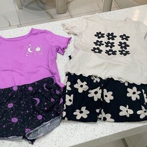 Charming pajama set with a purple top featuring celestial designs and matching shorts. Cream top with black floral patterns and coordinating shorts. Ideal for bedtime comfort.