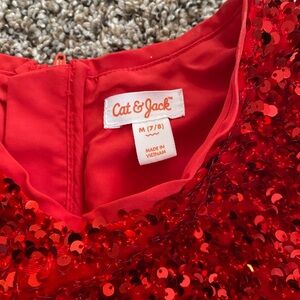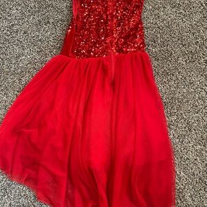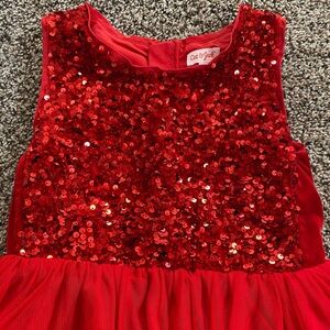Vibrant red dress with shimmering sequins. Ideal for festive events.