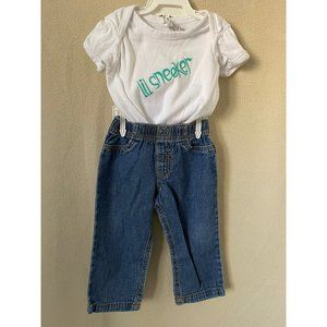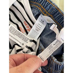 Cat & Jack White & Black Striped Onesie, Lil' Sneaker Onesie, Cat & Jack Jean Pants, 3-Piece Set. Size 18 Striped Onesie and Pants are Brand New never worn, White onesie is preowned, Better than normal wear. No discoloration, fading, stains, rips or holes. Clean, smoke-free home.
