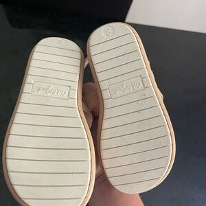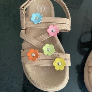 Adorable tan sandals with colorful floral accents. Perfect for playful outings.
