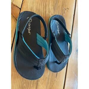 Cat & Jack Toddler Boys Flip Flops. Black w/ teal & Yellow. Size Large 9/10
