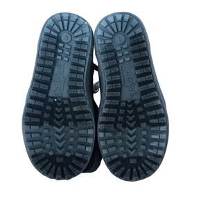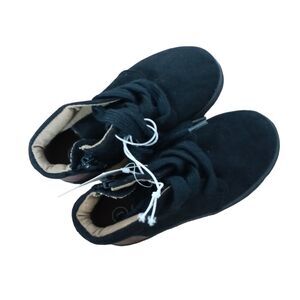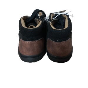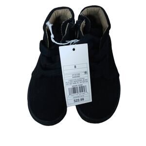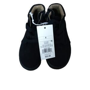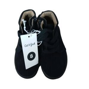 Cat & Jack Toddler Axel Boy's Size 8 mid top sneakers/boots in black with brown faux leather heel detail. Features a faux suede upper, lace-up front, and convenient side zipper for easy on/off. Designed with black rubber soles for durability and a polished look, these versatile shoes work well for both casual and dressy occasions.