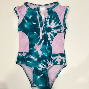 Adorable Cat & Jack one-piece swimsuit in size 3T. This cute suit features a trendy teal and lavender tie-dye design with a sporty front zip and cap sleeves. Made with breathable panels for added comfort and movement. Gently worn several times and in excellent condition—no stains or damage.