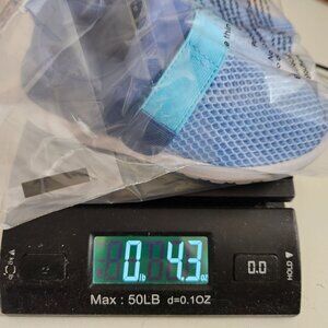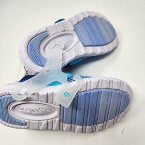 Bright blue sneakers with mesh design. Easy to wear with a secure strap. Ideal for active play.