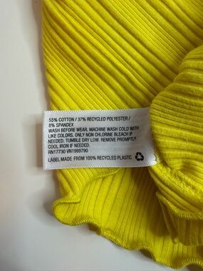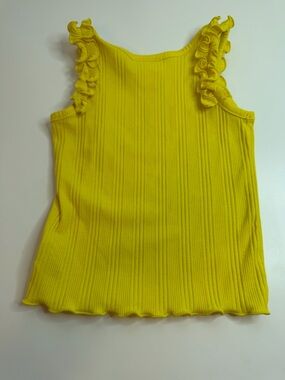 Vibrant yellow ribbed tank with ruffle shoulder accents. Soft stretch fabric for easy movement. Simple, sleeveless silhouette pairs well with shorts or skirts.