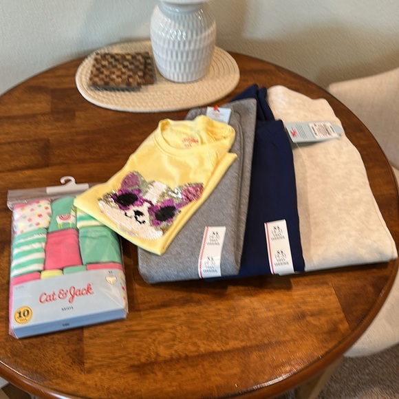 NWT Cat & Jack bundle. Includes two pairs of cozy leggings, one pair of joggers, a unopened pack of 4T underwear and one T-shirt. All size XS 4-5. All four items unworn, bought for my granddaughter, but she grew out of them before she got to wear them at my house. Bundle and save with other items from my closet, same day shipping. 💨📦