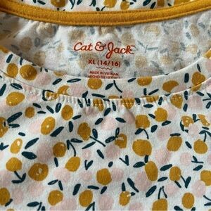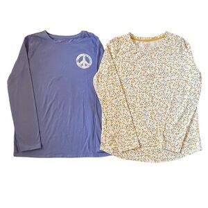 Good pre-owned condition! Cat & Jack bundle of 2 long-sleeve t-shirts. One has an abstract floral print reminiscent of lemons, and the other is periwinkle with a small, multicolor peace sign on the upper left chest. Both are Girls’ size 14/16. Smoke-free home!