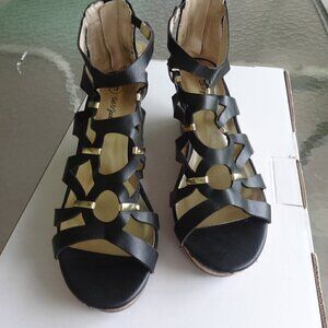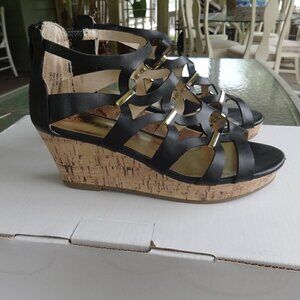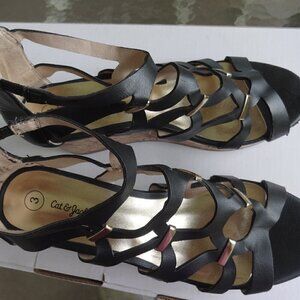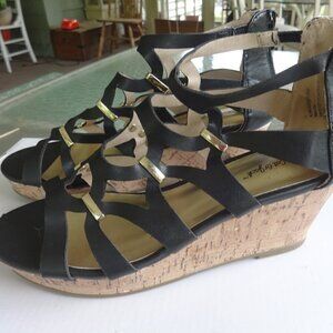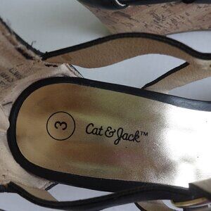 Cat & Jack cork wedge heel black strap sandals size 3, back zip, gold tone clips