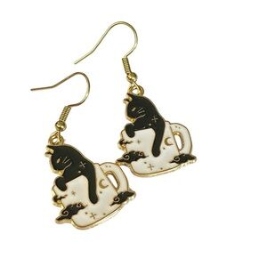 Cat Lady Dangle Pierced Earrings Silver Tone. Kitty in coffee cup easures approx 1.5” from top of earring wire to bottom of cat. Smiling cat earrings you will be proud to wear. #C-1