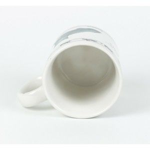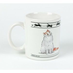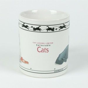 Just beneath the rim, is a cat and ribbon silhouette design. There's a small black mark on the side of the handle and one small defect in the design - also by the handle. Lastly, there is a small manufacturing defect by the gray cat's paw which looks to be a small area where the glazing didn't fill in. Despite these very minor issues, this is a nice mug! It measures just over 3.5" tall and 3.25" wide at the rim. There are no chips/cracks/repairs.