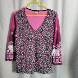 Women's XL V-neck Top/blouse. Black/white lace over pink, ruffled hem, 3/4 sleeves with cats on them!! I believe this is vintage based on the tag!! Please note the measurements below. This may run a little small.