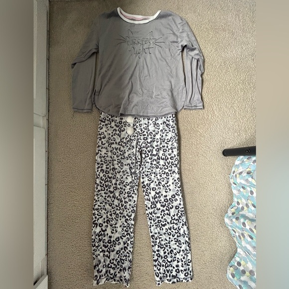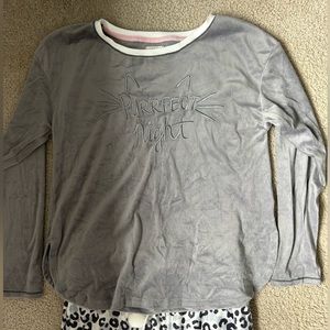 Super soft and thin material. Cute cat pajamas. The top says “Purrfect Night.” The bottoms have a chetah pattern to them.