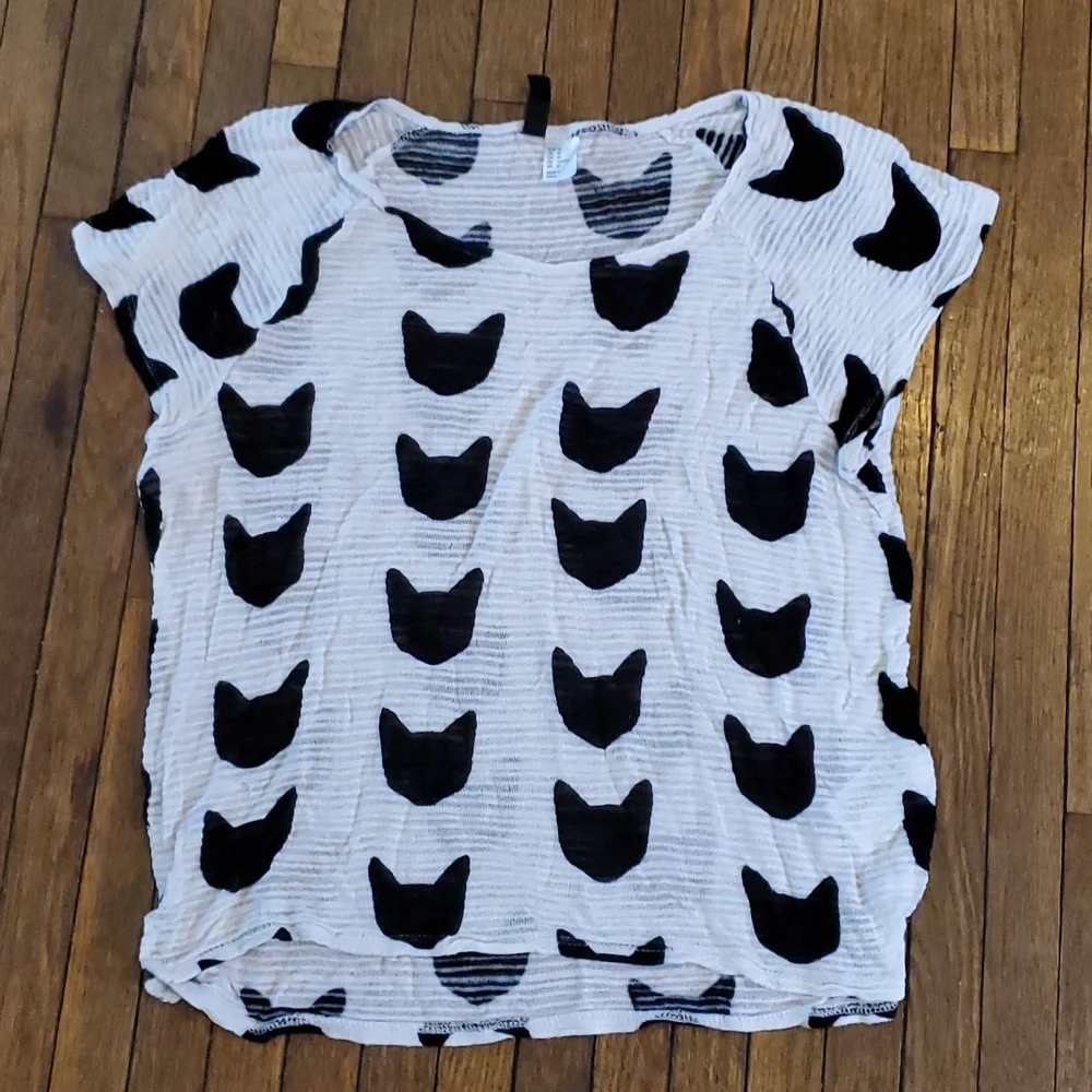 Cute cat pattern T-shirt. Nice and light fabric that doesn't cling too close to the body. Well worn but still in great shape! As shown in photos, only one small area with a pulled string. Size medium.
