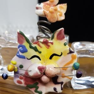 Whimsical cat pin, artfully painted with extended whiskers and little fish floating above.