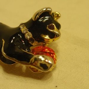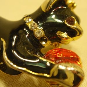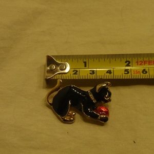 Vintage Rhinestone Collar Black Enamel Gold Tone Elegant Cat Brooch Pin. Features a Cat playing with a Red ball of Yarn. Perfect for an cat lover. Missing 1 rhinestone on the collar (see pictures).
