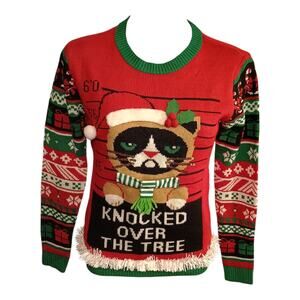 Cat Santa Mugshot Knocked Over The Tree No Bo Christmas Sweater Women's Size Sm