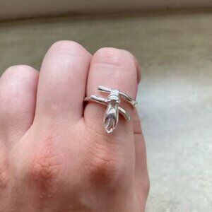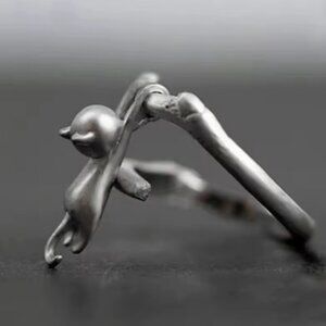Charming silver ring with a playful cat design. Perfect for animal lovers.