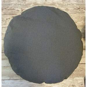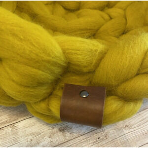 This is a cozy round bed made from mustard yellow chunky merino wool, suitable for cats or small dogs. The bed is soft and handmade, providing a warm and comfortable spot for your pet to rest. It is a unique and stylish addition to your pet's sleeping area. Bedding also has a brown leather Tag attached with the logo LO and a metal silver rivet to keep tag in place.