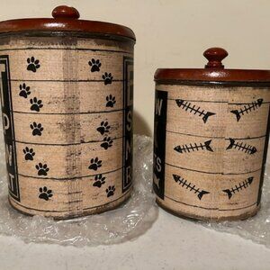 Here is a new galvanized metal Kitty Treats canister set displaying double-sided rustic designs with a pet theme on each canister. Set includes two different sized canisters with wooden lids that can nest inside each other for easy storage. Larger bin displays a fun cat-themed sentiment that reads "Eat Sleep Meow Repeat" with paw print pattern. Smaller bin displays a "Meow - Good Kitty - Treats" sentiment with fish bone pattern. This Kitty Treats canister set is ideal for storing packaged cat treats or accessories in style. A rustic cat-themed kitchen accessory perfect for everyday organization. And also makes a nice gift for the cat or kitty lovers, Has wood lids, The larger canister measures 7 inch high by 5.5 inch wide and the smaller one measures 6 inch high by 5 inch wide. Nice rustic canister set