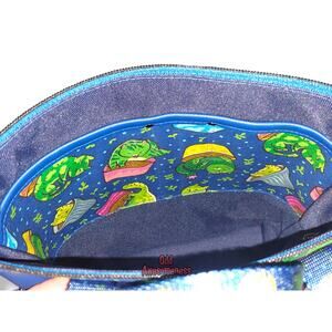 This slim, small size backpack features an adorable "Catcus" Kitty on the front and even more cactus and succlent style cats on the back. The blue accents are marine vinyl and the printed cat material is custom-printed woven cotton. The straps are 1" wide and feature a matching print on both sides. They are also adjustable. The same webbing that was used for the straps is used for the convienent handle at the top.