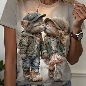 Cat T-Shirt, Girl and Boy Cat Kissing, Various Sizes Print is front and back