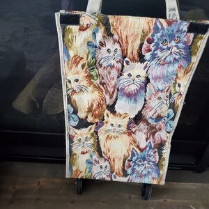 This is a vintage-inspired cat tapestry rolling travel bag with a collapsible design. It features embroidered cat accents on a light brown exterior with black lining. The bag has a rectangular shape with a zip and hook & loop closure, beige handles, and hardware. It is medium in size and has adjustable straps for convenience. The tapestry fabric is knit, and the design is themed around cats. Perfect for travel or shopping with a unique cat lady style.