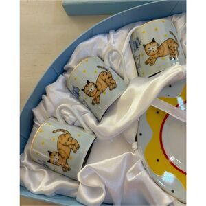 Darling set of 6 cups and saucers with a cute cat theme. Comes in an attractive half circle box with kitties on the lid. Nestled in white satin. Vintage but never used. Made by coffee and tea company.