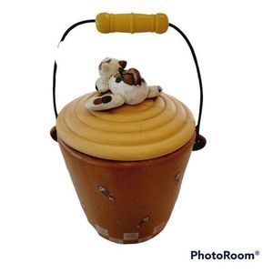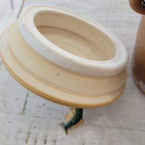 Cat Treat jar‎ with dangling fish brown and cream ceramic with wooden handle